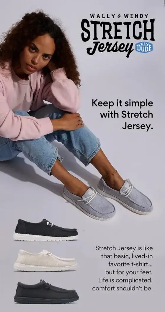 Stretch jersey is like that basic, lived-in favorite t-shirt...but for your feet. Life is complicated, comfort shouldn't be. Stop by and shop men's & women's stretch jersey in store today.