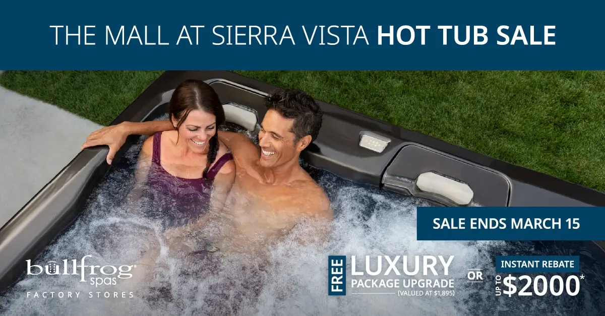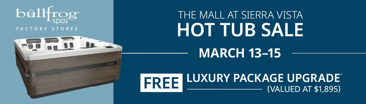 Don’t miss the Bullfrog Spas Indoor Hot Tub Sale at The Mall at Sierra Vista! Enjoy exclusive event savings and explore a wide variety of hot tub models — all conveniently located indoors across from the Food Court.
