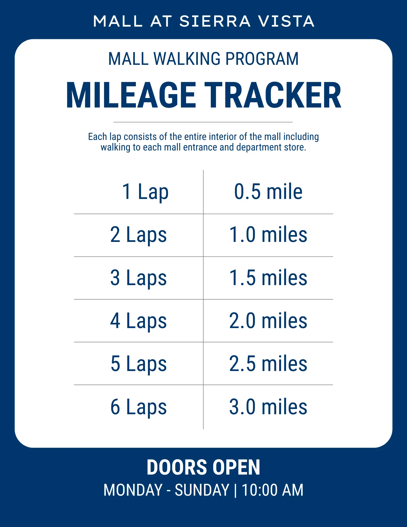 The Mall at Sierra Vista is closed for walking on Christmas Day, Easter, and Thanksgiving.